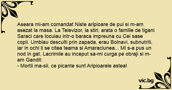 Aseara mi-am comandat Niste aripioare de pui si m-am asezat la masa. La Televizor, la stiri, arata o familie de tigani Saraci care locuiau intr-o baraca impreuna cu Cei sase copii. Umblau desculti prin zapada, erau Bolnavi, subnutriti, iar in ochi li se citea teama si Amaraciunea... Mi s-a pus un nod in gat, Lacrimile au inceput sa-mi curga pe obraji si m-am Gandit:
