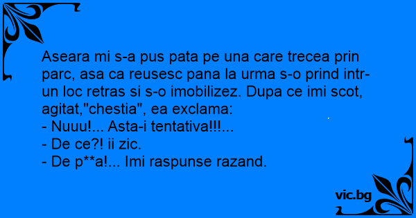 Aseara mi s-a pus pata pe una care trecea prin parc, asa ca reusesc pana la urma s-o prind intr-un loc retras si s-o imobilizez. Dupa ce imi scot, agitat,"chestia", ea exclama: