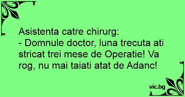 - Domnule doctor, luna trecuta ati stricat trei mese de Operatie! Va rog, nu mai taiati atat de Adanc!