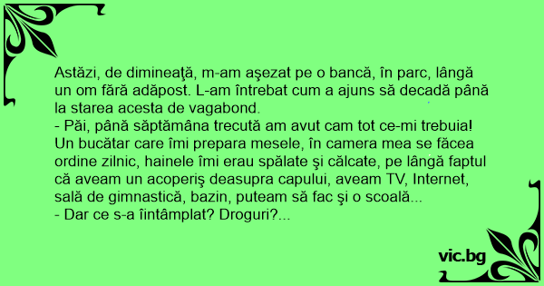 Astăzi, de dimineaţă, m-am aşezat pe o bancă, în parc, lângă un om fără adăpost. L-am întrebat сuм a ajuns să decadă până la starea acesta de vagabond.