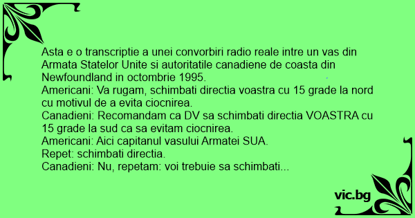 Toto je kopie rádiové konverzace mezi americkou námořní lodí a Kanaďany - nedaleko pobřeží Newfoundland, říjen 1995. Kanaďané: „Prosím, odkloňte váš kurz o 15 stupňů směrem na jih, abyste se...