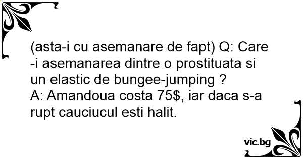 - Какво е общото между проститутка и бънджи скок? - И двете са евтини, бързи и ако гумата се скъса си мъртъв...