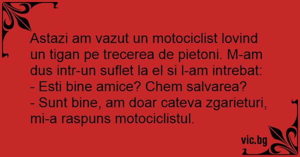 Astazi am vazut un motociclist lovind un tigan pe trecerea de pietoni. M-am dus intr-un suflet la el si l-am intrebat: