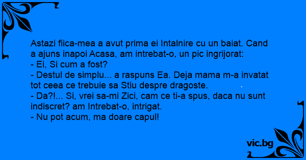 Astazi fiica-mea a avut prima ei Intalnire cu un baiat. Cand a ajuns inapoi Acasa, am intrebat-o, un pic ingrijorat: