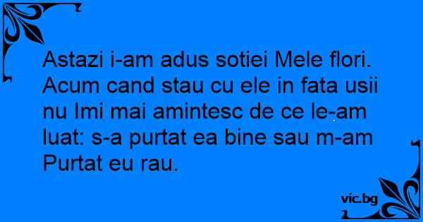 Astazi i-am adus sotiei Mele flori. Acum cand stau cu ele in fata usii nu Imi mai amintesc de ce le-am luat: s-a purtat ea bine sau m-am Purtat eu rau.