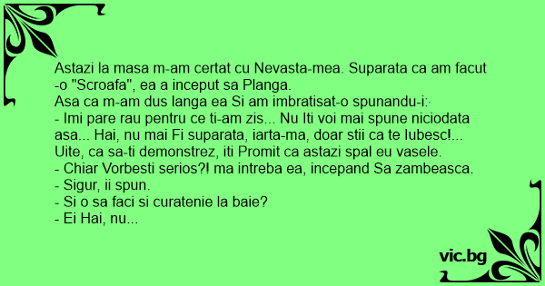 - Imi pare rau pentru ce ti-am zis... Nu Iti voi mai spune niciodata asa... Hai, nu mai Fi suparata, iarta-ma, doar stii ca te Iubesc!... Uite, ca sa-ti demonstrez, iti Promit ca astazi spal eu vasele.