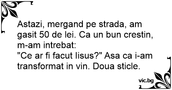 Az utcán sétáltam, amikor egy fickó zsebéből kiesett egy ezres. Felvettem, zsebre raktam, de akkor hirtelen belém hasított egy gondolat: "Vajon Jézus mit tenne ebben a helyzetben?" Így hát fogtam...