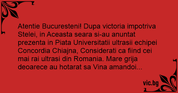 Atentie Bucuresteni! Dupa victoria impotriva Stelei, in Aceasta seara si-au anuntat prezenta in Piata Universitatii ultrasii echipei Concordia Chiajna, Considerati ca fiind cei mai rai ultrasi din Romania. Mare grija deoarece au hotarat sa Vina amandoi...