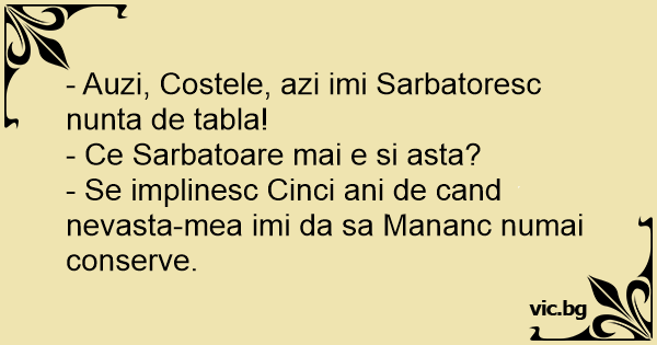 - Se implinesc Cinci ani de cand nevasta-mea imi da sa Mananc numai conserve.