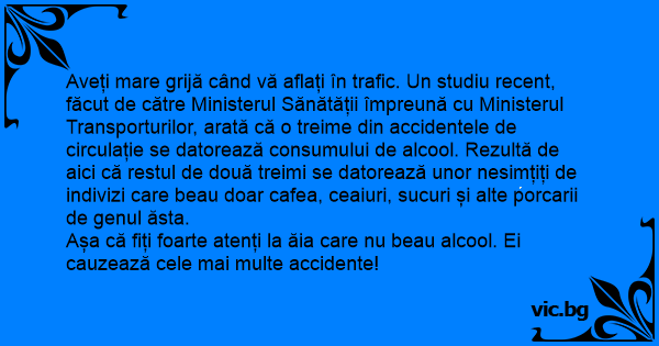 Aveți mare grijă când vă aflați în trafic. Un studiu recent, făcut de către Ministerul Sănătății împreună cu Ministerul Transporturilor, arată că o treime din accidentele de circulație se datorează consumului de alcool. Rezultă de aici că restul de două treimi se datorează unor nesimțiți de indivizi care beau doar cafea, ceaiuri, sucuri și alte porcarii de genul ăsta.