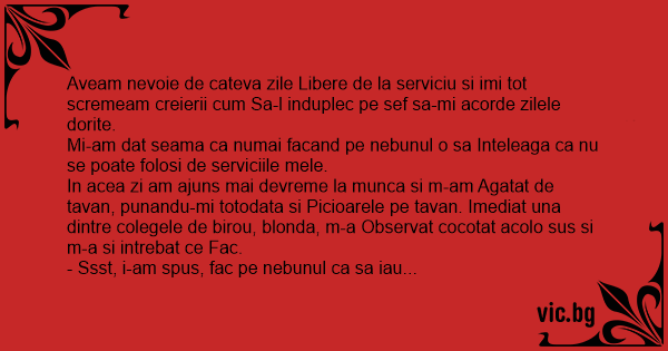 In acea zi am ajuns mai devreme la munca si m-am Agatat de tavan, punandu-mi totodata si Picioarele pe tavan. Imediat una dintre colegele de birou, blonda, m-a Observat cocotat acolo sus si m-a si intrebat ce Fac.