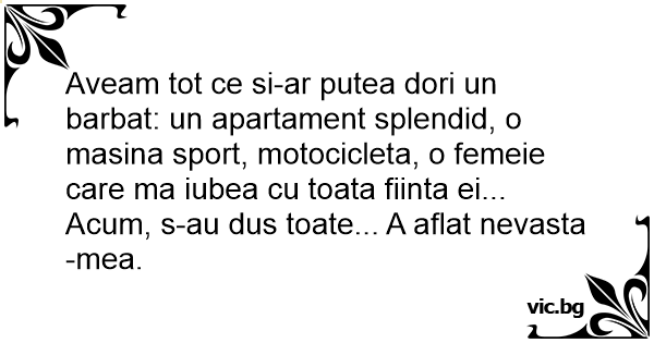 Aveam tot ce si-ar putea dori un barbat: un apartament splendid, o masina sport, motocicleta, o femeie care ma iubea cu toata fiinta ei... Acum, s-au dus toate... A aflat nevasta-mea.