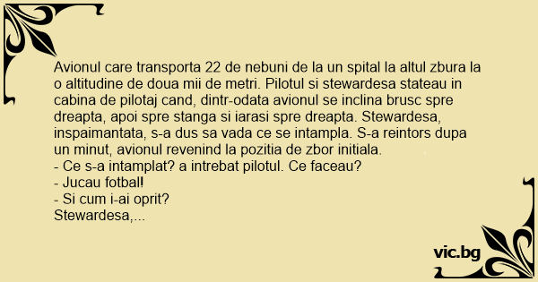 Avionul care transporta 22 de nebuni de la un spital la altul zbura la o altitudine de doua mii de metri. Pilotul si stewardesa stateau in cabina de pilotaj cand, dintr-odata avionul se inclina brusc spre dreapta, apoi spre stanga si iarasi spre dreapta. Stewardesa, inspaimantata, s-a dus sa vada ce se intampla. S-a reintors dupa un minut, avionul revenind la pozitia de zbor initiala.