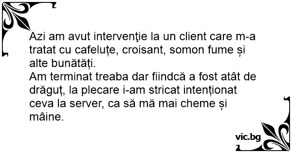 Am terminat treaba dar fiindcă a fost atât de drăguț, la plecare i-am stricat intenționat ceva la server, ca să mă mai cheme și mâine.