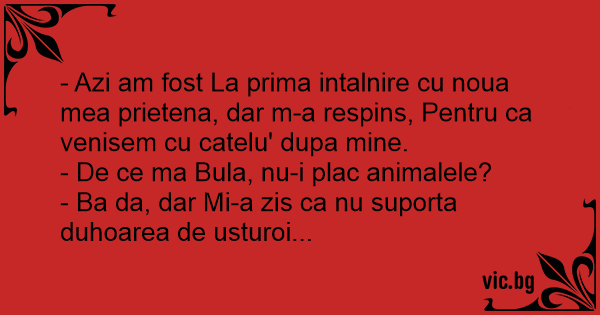 - Azi am fost La prima intalnire cu noua mea prietena, dar m-a respins, Pentru ca venisem cu catelu' dupa mine.