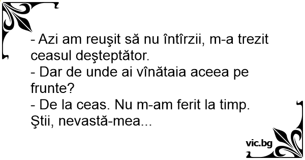 - Azi am reuşit să nu întîrzii, m-a trezit ceasul deşteptător.
