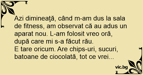 Azi dimineaţă, când m-am dus la sala de fitness, am observat că au adus un aparat nou. L-am folosit vreo oră, după care mi s-a făcut rău.