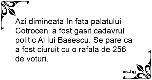 Azi dimineata In fata palatului Cotroceni a fost gasit cadavrul politic Al lui Basescu. Se pare ca a fost ciuruit cu o rafala de 256 de voturi.
