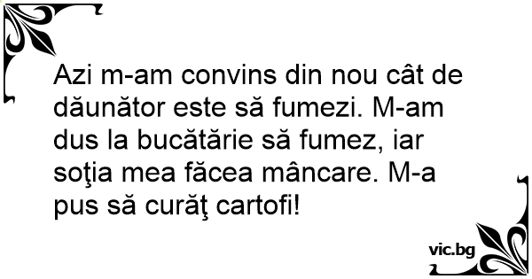 Azi m-am convins din nou cât de dăunător este să fumezi. M-am dus la bucătărie să fumez, iar soţia mea făcea mâncare. M-a pus să curăţ cartofi!