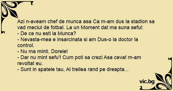 Azi n-aveam chef de munca asa Ca m-am dus la stadion sa vad meciul de fotbal. La un Moment dat ma suna seful: