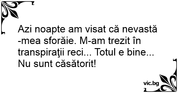 Azi noapte am visat că nevastă-mea sforăie. M-am trezit în transpiraţii reci... Totul e bine... Nu sunt căsătorit!