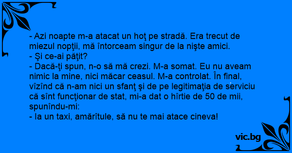 - Azi noapte m-a atacat un hoţ pe stradă. Era trecut de miezul nopţii, mă întorceam singur de la nişte amici.