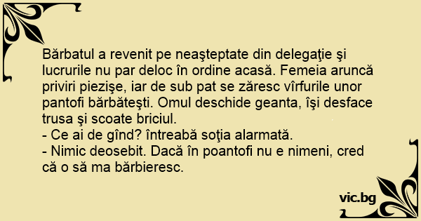 Bărbatul a revenit pe neaşteptate din delegaţie şi lucrurile nu par deloc în ordine acasă. Femeia aruncă priviri piezişe, iar de sub pat se zăresc vîrfurile unor pantofi bărbăteşti. Omul deschide geanta, îşi desface trusa şi scoate briciul.