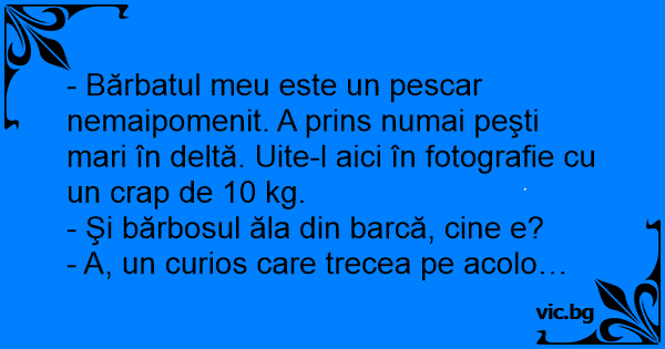 - Bărbatul meu este un pescar nemaipomenit. A prins numai peşti mari în deltă. Uite-l aici în fotografie cu un сrар de 10 kg.