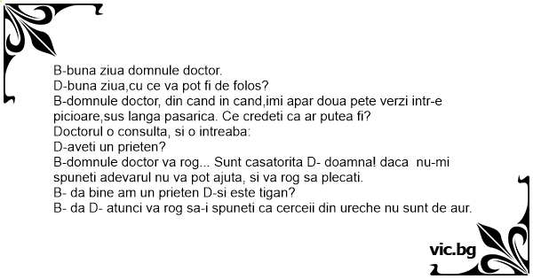 Мъж отива при лекаря и казва, че отстрани на бедрата му са се появили зелени петна. Докторът: - Добре. Дай да видя. Докторът преглежда мъжа и пита: - Случайно да живееш с циганка? - Да, така...