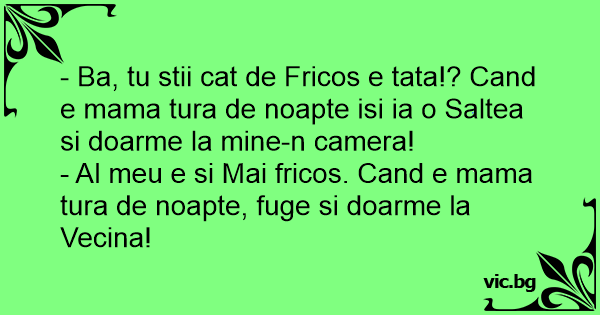 - Ba, tu stii cat de Fricos e tata!? Cand e mama tura de noapte isi ia o Saltea si doarme la mine-n camera!