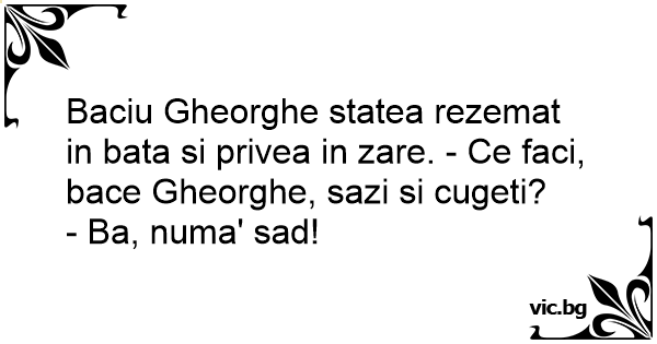 Baciu Gheorghe statea rezemat in bata si privea in zare. - Ce faci, bace Gheorghe, sazi si cugeti?