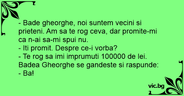 - Bade gheorghe, noi suntem vecini si prieteni. Am sa te rog ceva, dar promite-mi ca n-ai sa-mi spui nu.