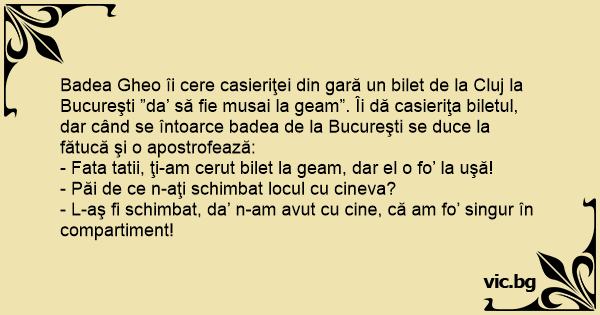 Badea Gheo îi cere casieriţei din gară un bilet de la Cluj la Bucureşti ”da’ să fie musai la geam”. Îi dă casieriţa biletul, dar când se întoarce badea de la Bucureşti se duce la fătucă şi o apostrofează: