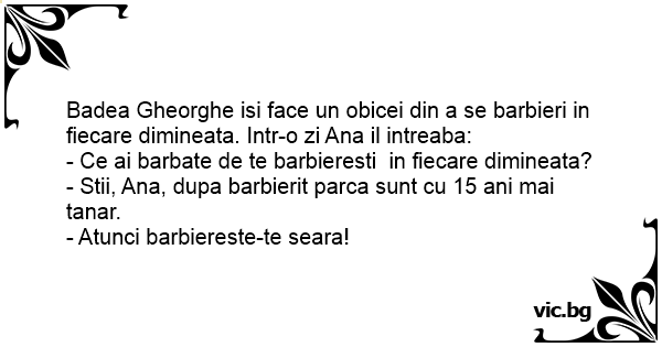 Badea Gheorghe isi face un obicei din a se barbieri in fiecare dimineata. Intr-o zi Ana il intreaba: