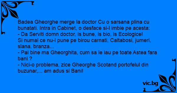 Badea Gheorghe merge la doctor Cu o sarsana plina cu bunatati. Intra in Cabinet, o desface si-l imbie pe acesta: