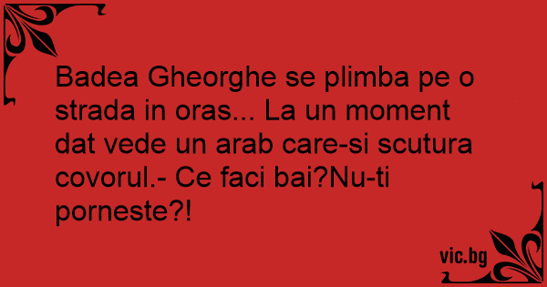 Badea Gheorghe se plimba pe o strada in oras... La un moment dat vede un arab care-si scutura covorul.- Ce faci bai?Nu-ti porneste?!