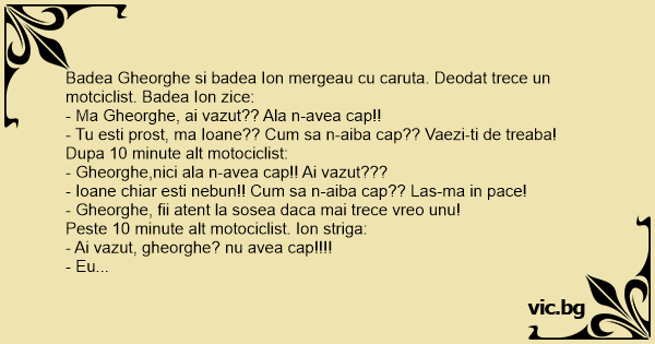 Badea Gheorghe si badea Ion mergeau cu caruta. Deodat trece un motciclist. Badea Ion zice: