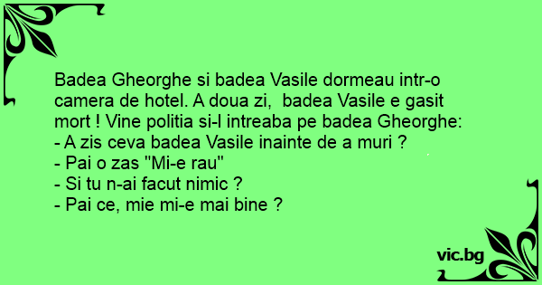 Badea Gheorghe si badea Vasile dormeau intr-o camera de hotel. A doua zi, badea Vasile e gasit mort ! Vine politia si-l intreaba pe badea Gheorghe:
