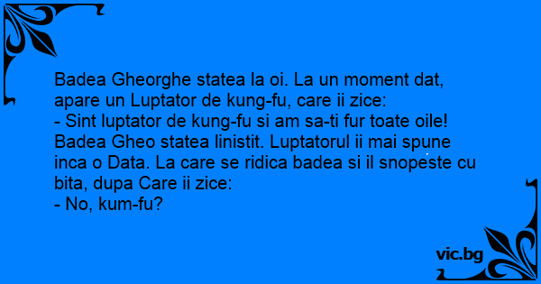 Badea Gheorghe statea la oi. La un moment dat, apare un Luptator de kung-fu, care ii zice: