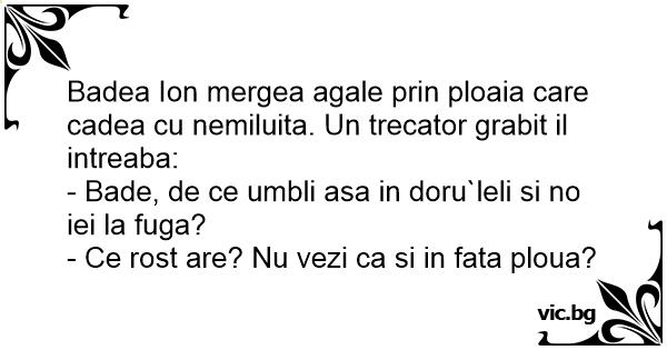 Badea Ion mergea agale prin ploaia care cadea cu nemiluita. Un trecator grabit il intreaba: