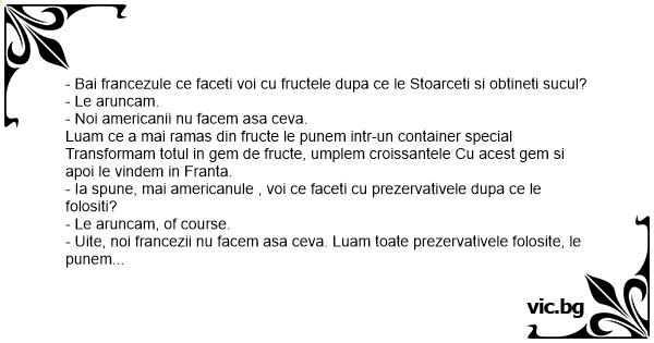 - Uite, noi francezii nu facem asa ceva. Luam toate prezervativele folosite, le punem intr-un container special, le reciclam, transformam totul in guma de mestecat Si apoi le vindem in America!