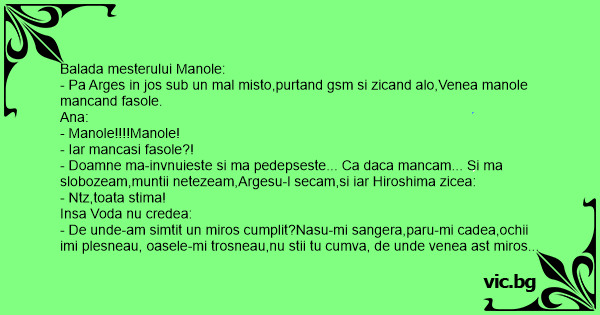 - Pa Arges in jos sub un mal misto,purtand gsm si zicand alo,Venea manole mancand fasole.