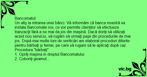 Un afiş la intrarea unei bănci: Vă informăm că banca noastră va instala Bancomate noi, ce vor permite clienţilor să efectueze tranzacţii fără a se mai da jos din maşină. Dacă doriţi să utilizaţi acest nou serviciu, vă rugăm să urmaţi paşii din procedurile de mai jos. După mai multe luni de verificări am elaborat proceduri diferite pentru bărbaţi şi femei, pe care vă rugam să le aplicaţi după caz.
