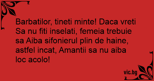 Barbatilor, tineti minte! Daca vreti Sa nu fiti inselati, femeia trebuie sa Aiba sifonierul plin de haine, astfel incat, Amantii sa nu aiba loc acolo!