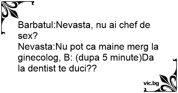 Nevasta:Nu рот ca maine merg la ginecolog, B: (dupa 5 minute)Da la dentist te duci??