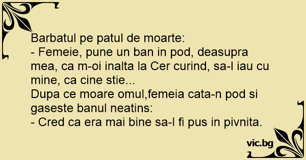 - Femeie, pune un ban in pod, deasupra mea, ca m-oi inalta la Cer curind, sa-l iau cu mine, ca cine stie...