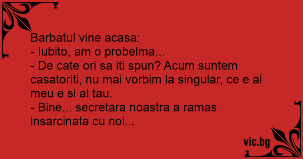 - De cate ori sa iti spun? Acum suntem casatoriti, nu mai vorbim la singular, ce e al meu e si al tau.