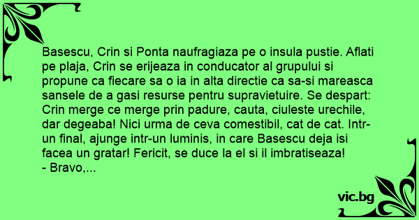 Basescu, Crin si Ponta naufragiaza pe o insula pustie. Aflati pe plaja, Crin se erijeaza in conducator al grupului si propune ca fiecare sa o ia in alta directie ca sa-si mareasca sansele de a gasi resurse pentru supravietuire. Se despart: Crin merge ce merge prin padure, cauta, ciuleste urechile, dar degeaba! Nici urma de ceva comestibil, cat de cat. Intr-un final, ajunge intr-un luminis, in care Basescu deja isi facea un gratar! Fericit, se duce la el si il imbratiseaza!