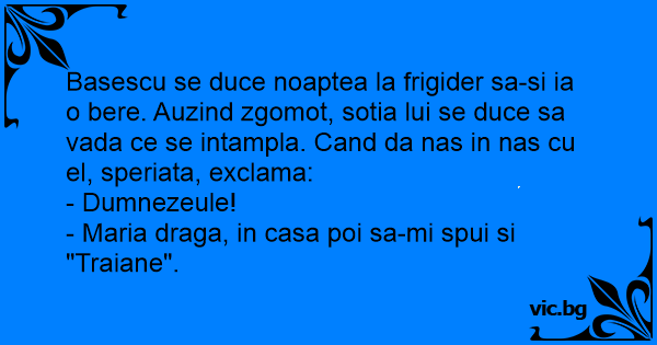 Basescu se duce noaptea la frigider sa-si ia o bere. Auzind zgomot, sotia lui se duce sa vada ce se intampla. Cand da nas in nas cu el, speriata, exclama: