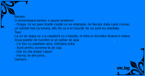 La un an dupa ce s-a casatorit cu o taurita, el intra in dormitor tinand in mana doua pastile de nurofen si un pahar de apa.